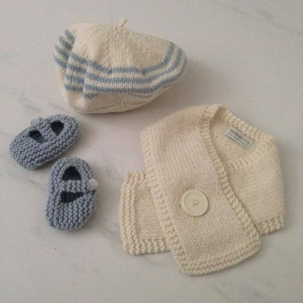 Hand-knitted merino Beret Button Scarf and Mary Janes set for a sweet baby gift. Includes a soft scarf with a button fastening, a cosy beret with a wide garter rim to cover tiny ears and a pair of adorable Mary Janes.